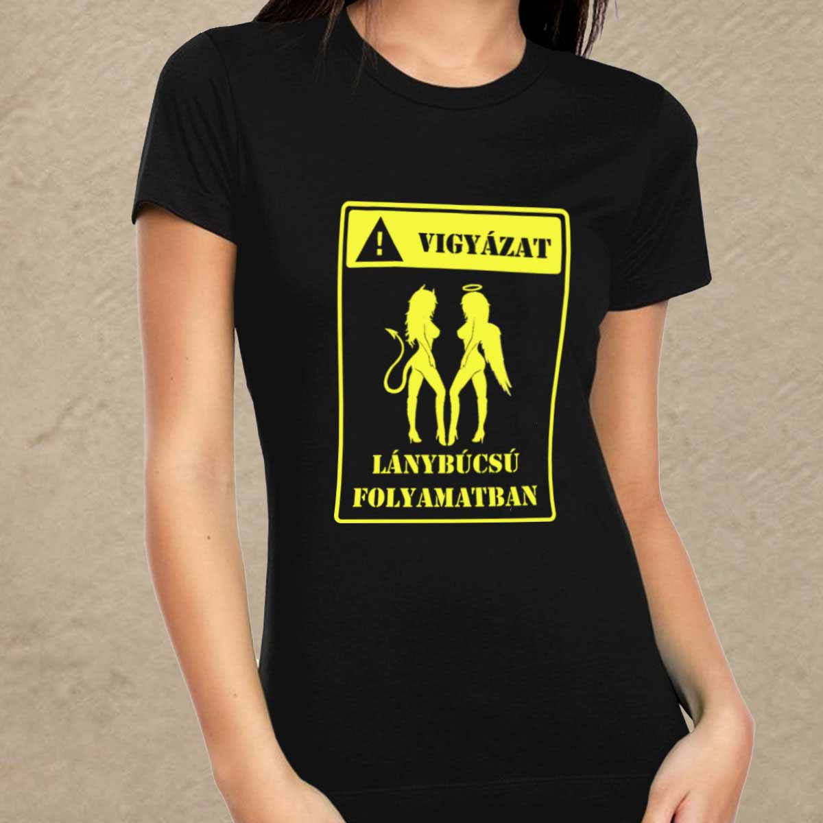 Vigyázat lánybúcsú fekete női póló